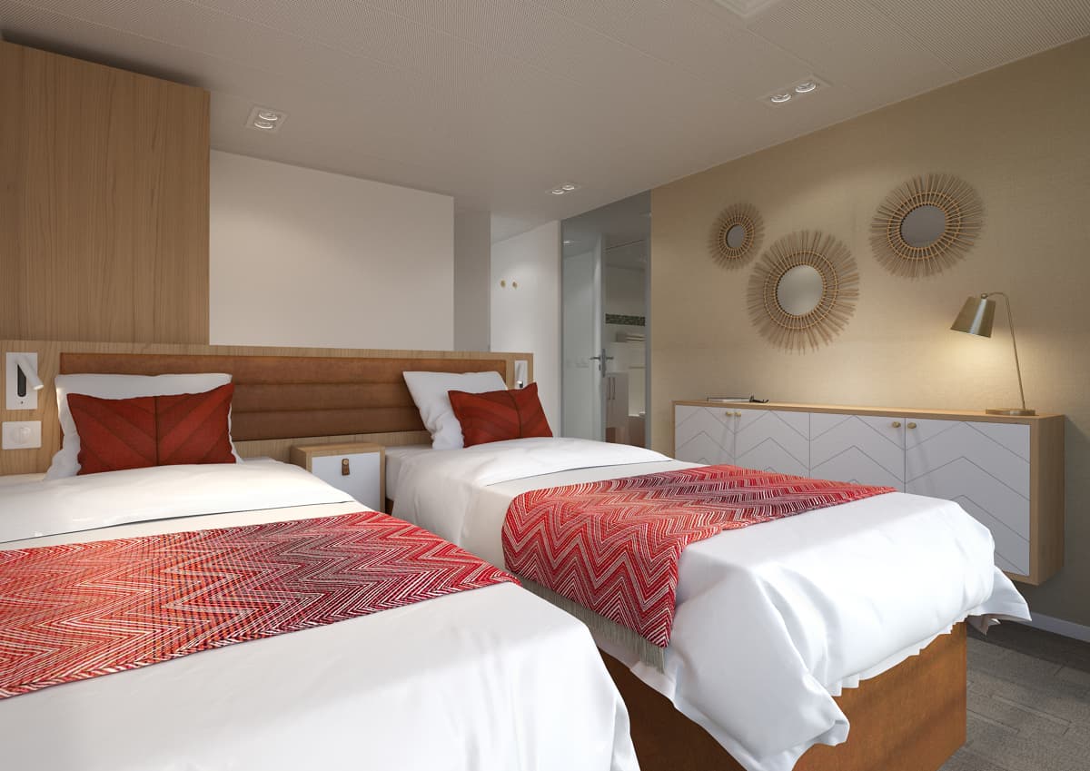 Construit en 2018 et inauguré en 2019, ce bateau de catégorie 5 ancres propose de vastes espaces dans les cabines et dans les parties communes. De larges baies vitrées aux ponts supérieur et intermédiaire permettent d’apprécier le paysage durant la navigation. 4 suites sont réparties sur ces deux ponts, 2 d’entre elles situées sur le pont supérieur disposent de terrasse privative avec transats.